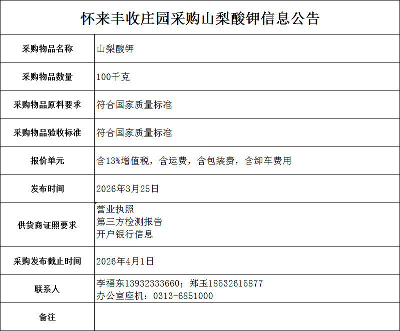 怀来丰收庄园采购山梨酸钾信息公告