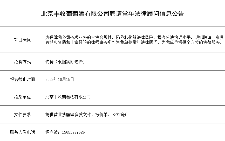 北京丰收葡萄酒有限公司聘请常年法律顾问信息公告