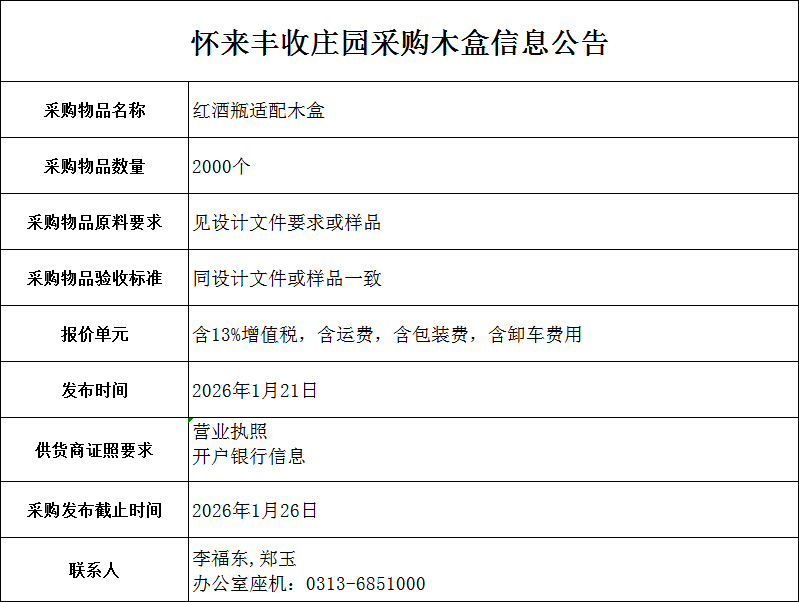 怀来丰收庄园采购木盒信息公告